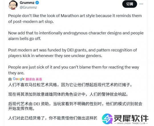 致力于反woke的推主Grummz显然坚守传统美学阵地,他批评Bungie《失落星船:马拉松》的角色设计故意模糊了性别界限。