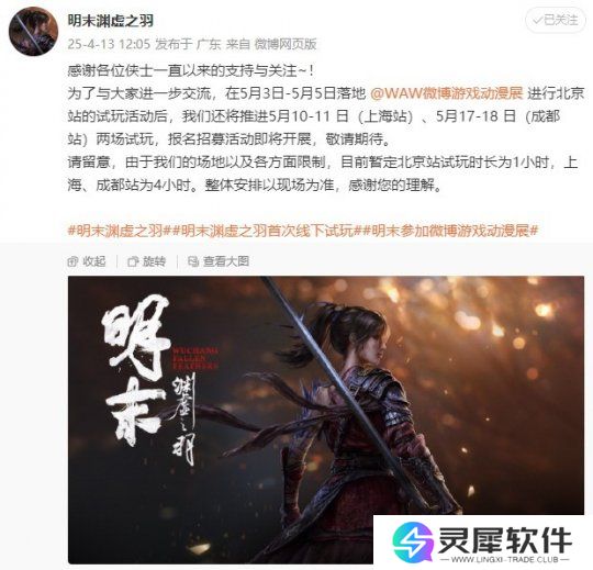 《明末:渊虚之羽》还将推进5月10-11日(上海站)、5月17-18日(成都站)两场试玩,报名招募活动即将开展。由于场地以及各方面限制,目前暂定北京站试玩时长为1小时,上海和成都站为4小时,整体安排以现场为准。
